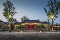 a red door with the lights on lit up in an outdoor setting with benches and trees