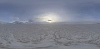 the sun is peeking through a cloudy sky over some sand dunes with the ocean on one side