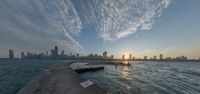 A sunny day in Chicago, with the city skyline visible against a clear blue sky. The coastal shore is lined with modern architecture and a pier extends into the sparkling waters of Lake Michigan.