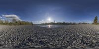 a beach with water near some trees and a sun light over it is shown in a fish - eye picture
