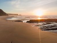 Aerial view of Portugal's coastal landscape. Sunlit beaches with clear skies offer a picturesque scene. Elevated position enhances the ocean's impressive expanse. Experience Europe's scenic sunny shores.
