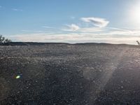 a person on a motorcycle stands in a rocky field as the sun rises behind them