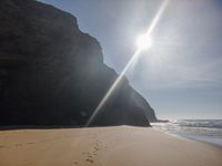 A clear sky and visible sun illuminate Portugal's coastline. The European landscape features open spaces, sandy beaches, and inviting ocean waters. A picturesque day by the sea.