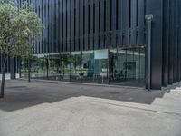 A sunny day in Barcelona's bustling business district. Modern architecture and urban design create a cityscape of sleek office buildings. Hard shadows highlight the surfaces of the asphalt streets, casting a contemporary vibe.