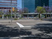 A sunny day in Barcelona's business district. Modern architecture and office buildings cast hard shadows on the bustling streets. Traffic lights guide the flow of urban life in this vibrant city of Spain.