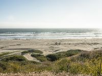 This is an image of a coastal road in California, USA. The asphalt road runs along the shore, surrounded by sand and open grassy spaces. The day is gloomy with grey skies, fog, and contrails visible in the air. In the distance, the ocean waves crash against the beach. Despite the gloomy weather, there is a glimpse of sunshine breaking through the clouds, creating a contrasting scene of clear sky and surface. This photo captures the natural environment and landscape of California's coastal region.