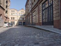 A sunny day in Berlin's business district with classic architecture. Cobblestone roads and brick buildings create a charming urban atmosphere. Shadows play on the surface of the road, highlighting the city's art district.