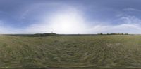 Sunny day in Brandenburg, Germany. Vast open spaces with lush greenery and grass surfaces. The sun visible through scattered clouds, creating a picturesque landscape.