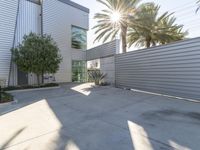 This is an image of a sunny day in downtown Los Angeles. The photo showcases the modern architecture and urban landscape of the city. In the foreground, a concrete street leads to a parking lot surrounded by office buildings. The clear sky and visible sun illuminate the scene, creating a vibrant and energetic atmosphere. The metal walls and open spaces of the business district provide a contrast to the bustling streets. This photo captures the essence of Los Angeles, combining the city's architecture, sunshine, and thriving business environment.
