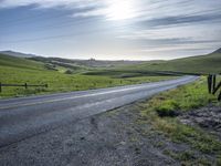 A sunny day in California's highlands, showcasing the lush green fields and agricultural landscapes. The elevated road surface meanders through the mountains, offering a picturesque view of the horizon and natural environment.
