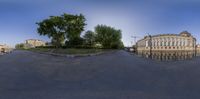 a panorama of a park bench on a sunny day in a city square with a clock tower