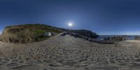 a fisheye image of a beach scene on a sunny day with sun and blue skies