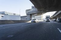 A sunny day on the highway, with clear skies and the sun visible. Cars zoom by on the asphalt road, creating a motion blur effect. The road passes under a concrete bridge, showcasing the city's infrastructure.