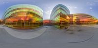 multiple spherical pictures depicting two different architectural buildings on a sunny day in a city park