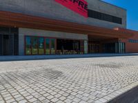 This image captures a sunny day in Hong Kong with a clear sky. The road in the foreground leads to various shops and restaurants. The storefronts are visible along the paver road, creating a vibrant and lively atmosphere. The sun shines brightly, casting a warm glow on the scene. This photo represents a perfect day to go shopping and enjoy outdoor dining in Hong Kong.