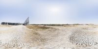 A sunny day in Kenosha, Wisconsin. A dirt road leads to an industrial building, surrounded by open space and construction. The panoramic view captures the progress of the structure with a lens flare and the sun visible in the background.