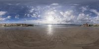 A sunny day in Lisbon, Portugal. The beach overlooks the calm ocean, with clouds creating a picturesque horizon. The open space is lined with architecture and infrastructure, including bridges and underpasses.