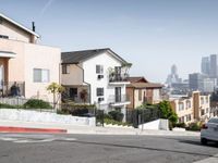 Clear sky over Los Angeles, California; a city road traverses the urban and suburban residential areas. Daytime asphalt landscape enhances the sunny California cityscape.