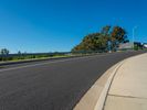 the sun shines over an empty street on a clear day near a hill with grass and trees