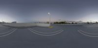 a skate park with the view of a building on it's sides and a light pole