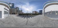 a panorama lens image of a street in front of some buildings and windows looking at a bike