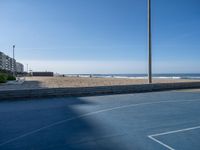 A sunny day in Porto, Portugal with clear skies and hard shadows casting on the coastal open space. Beach basketball court overlooks the ocean. Shadows play on the European coastline.