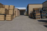 This image depicts a bright and sunny day at a retail hardware store. The straight road in front is made of concrete, leading to the concrete facade of the store building. On the pavement, there are stacks of wicker boxes and pallets, showcasing the wide variety of wood products and lumber available. This bustling retail business provides hardware and construction materials to customers in the urban area. The clear sky overhead adds to the overall pleasant atmosphere. This photo captures the urban design and bustling activity at the hardware store.