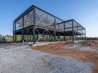 A sunny day in the USA, showcasing a clear sky and a construction site. The building stands tall amidst the dirt and gravel surface. Steel equipment and tracks line the road, highlighting the ongoing construction.