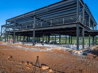 A sunny day at a construction site in the USA. Clear skies above a building under construction. Equipment and steel structures on a dirt and gravel surface. Off-road track leads to the office building.