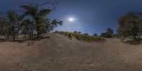 the sun shines brightly on a clear day, while a man rides a dirt bike on a trail