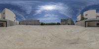 a panoramagraph looking outside at a skateboard park in a skate park area on a sunny day