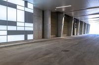 A profile view of a concrete road in Toronto, Canada. It's a sunny day with cars parked in a parking garage and driveway entries. The concrete street leads to a parking deck.