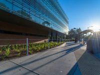 A sunny day in Los Angeles, California, where people walk down the sidewalk near a modern office building. The clear sky and hard shadows highlight the city's urban design. The sun shines through the windows, illuminating the concrete surfaces.