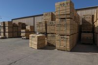 A sunny day in an urban landscape, with a clear sky. A road surface made of concrete and brickwork stretches ahead. Retail businesses, including a hardware store and lumberyard, offer a variety of wood products like flooring and pallets.