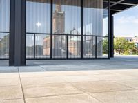 This stock photo features a stunning view of a high-rise glass building located in the bustling financial district of Berlin, Germany. The image captures the iconic clock tower against a clear blue sky, creating a gorgeous contrast against the sleek glass facade of the building. The architecture showcases modern design and urban aesthetics. The open courtyard in front of the building provides an inviting space with chairs, pavers, and lush vegetation, making it a perfect representation of city life. This photo can be used to depict a variety of concepts related to business, urban design, and modern architecture.