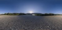 view into the fish eye lens with a sun over some bridges and trees in the background