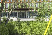 Modern office building in Toronto, Canada with a sunny facade. The building has a sleek and stylish design, with a driveway lined with lush vegetation. Toronto's real estate at its finest.