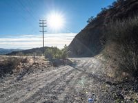 A sunny day in Los Angeles, California. A low road leads through rugged mountain landscape, surrounded by nature. Clear sky and visible sun accentuate the cityscape and skyline. Recreational off-road track with sand and gravel.
