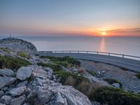 This image captures a scenic view of a curved road along the coastline of Mallorca, Spain. As the sun sets on the horizon, its warm rays illuminate the asphalt road and the surrounding landscape. The Armco barrier and guard rail provide safety along the road, ensuring a smooth journey for drivers. The clear sky with visible clouds reflects the sunny and peaceful atmosphere of the coastal area. In the distance, a lighthouse stands tall, adding to the beauty and charm of the natural surroundings. This photo represents the calm and serene beauty of Mallorca at dawn.