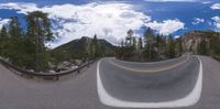 the view from a fish eye lens shows a curve in the road as clouds float by