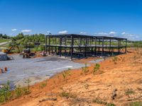 A high position aerial view of a construction site in the USA. The clear sky contrasts with the steel structures and gravel surfaces. Construction equipment can be seen on the elevated dirt area. A bright and sunny day at the job site.