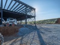 A sunny day at a construction site in the USA. The building's steel structure casts hard shadows on the gravel surface. Equipment and off-road tracks indicate active construction. Clear skies reveal an architectural masterpiece.