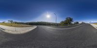 the sun shines over an empty street on a clear day near a hill with grass and trees