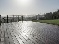 This stock photo shows a sunny terrace with a wooden deck and a black railing in Los Angeles, California, USA. The deck overlooks a soccer field and a beautiful open space with green grass and trees. The architecture of the deck is low and it blends beautifully with the surrounding nature. The sun is shining brightly, casting a warm light on the wood floor and the guard rail. It's a perfect spot to enjoy a sunny day and soak in the natural beauty of the area. The clear sky adds to the overall picturesque view, making it a great place for recreational activities like walking or simply enjoying the scenery. Overall, this photo captures the serene and inviting atmosphere of this sunny terrace.
