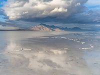Utah's Salt Lake City desert landscape under a clear sunny day. Mountains in the distance add to the open space charm. The sun shining brightly on the salt flats creates a picturesque scene.
