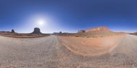 A sunny day in Utah, USA, with a clear sky and the sun visible over open landscape. Gravel and dirt surfaces dominate the terrain, contrasting with rocky areas. Asphalt roads pave through the nature-filled scenery.