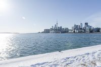 A sunny winter day in Toronto. The modern architecture of the city skyline reflects onto the calm surface of the lake. The coastal road leads to a pier with a clear sky and visible contrails overhead.