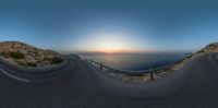 A breathtaking sunrise over the Balearic Islands of Spain, casting a golden glow on the coastal landscape. The curved road meanders through the mountains, offering a scenic drive. The Armco barrier provides safety along the elevated road.