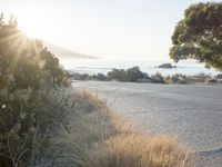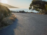 A picturesque coastal road curves along the shore, surrounded by rugged terrain and lush grass. The asphalt road surface glistens in the early morning sunlight, leading towards a stunning view of the ocean. The clear, winter sky is illuminated by the glowing sun, with the horizon framed by fluffy clouds and faint contrails. In the distance, a solitary tree stands tall on a hill overlooking a peaceful lake and a beautiful bay. The sandy beach and calm waters create a serene and inviting atmosphere.