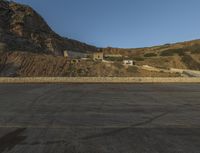 This stunning stock photo captures the beauty of a building nestled in the middle of a mountain range, with a grand rock wall on both sides. The image showcases the breathtaking dawn, as the first light of the day paints the clear sky in vibrant hues. The rugged terrain and open space surrounding the structure perfectly blend with the natural landscape, providing a tranquil and picturesque scene. This coastal location in Europe, specifically in Portugal, offers a unique combination of brown valleys, sloping hills, and an expansive ocean view. The image highlights the impressive mountains, showcasing their bedrock profiles and the formation of the plateau. The concrete road surface adds an element of human presence to the otherwise untouched nature.